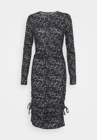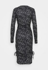 Robe noire à manches longues avec un motif floral, présentant des accents blancs et verts. Le design inclut une jupe froncée avec des liens ajustables.