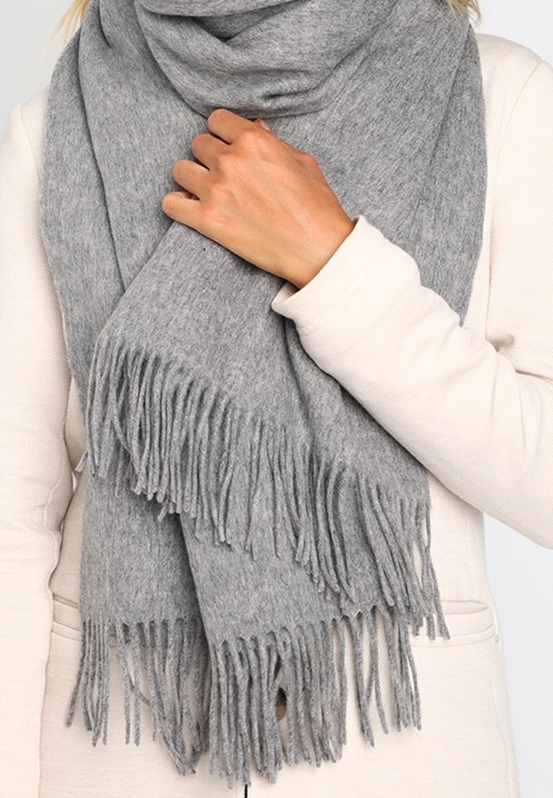 Personne portant un manteau beige tenant une grande écharpe grise douce avec de longs franges enroulée autour du cou.