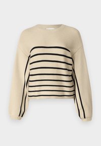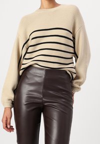 Pull en maille beige à rayures horizontales noires porté avec un pantalon en cuir marron foncé.