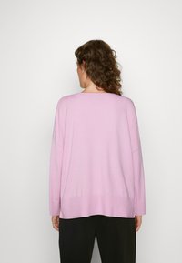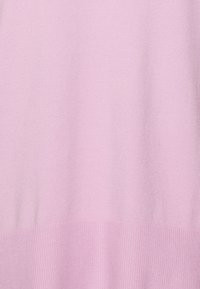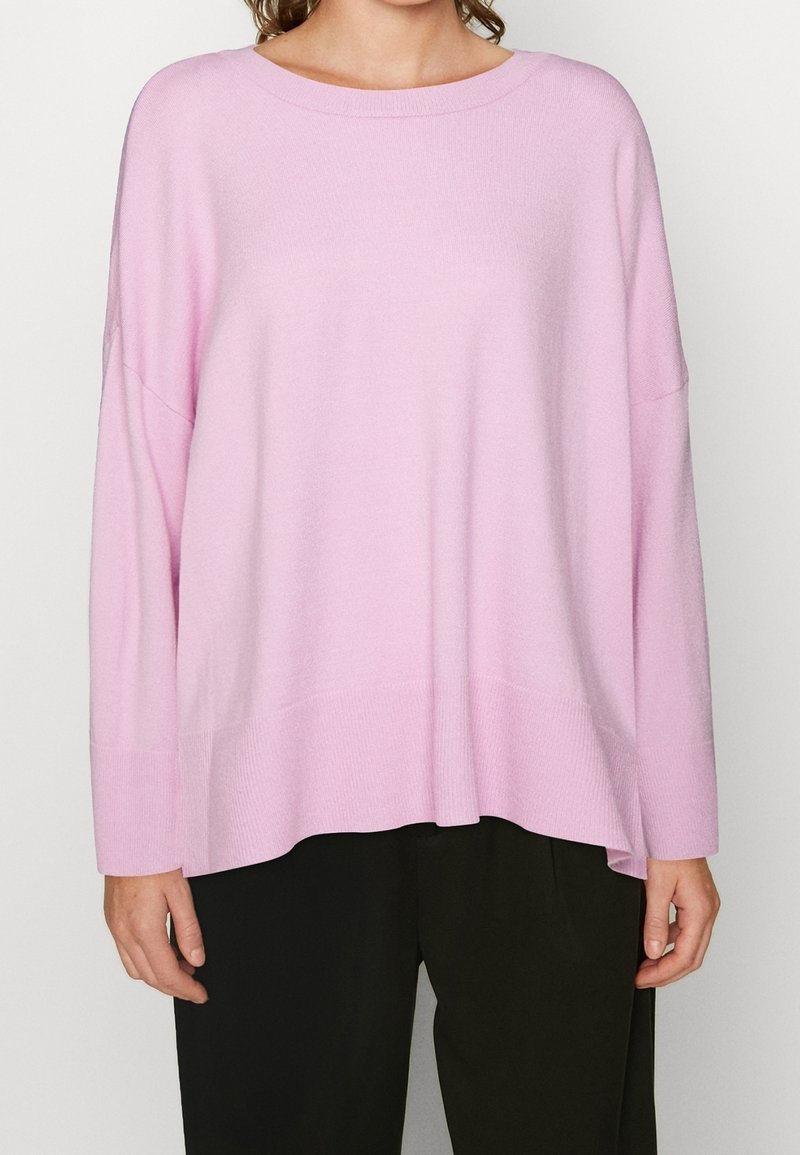 Pull surdimensionné rose clair en tissu tricoté doux, avec un col rond large et des épaules tombantes, bordé d'un ourlet côtelé.