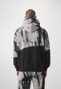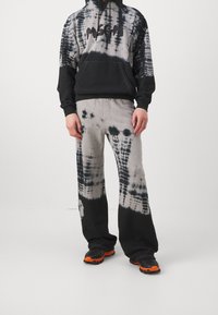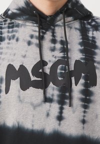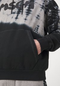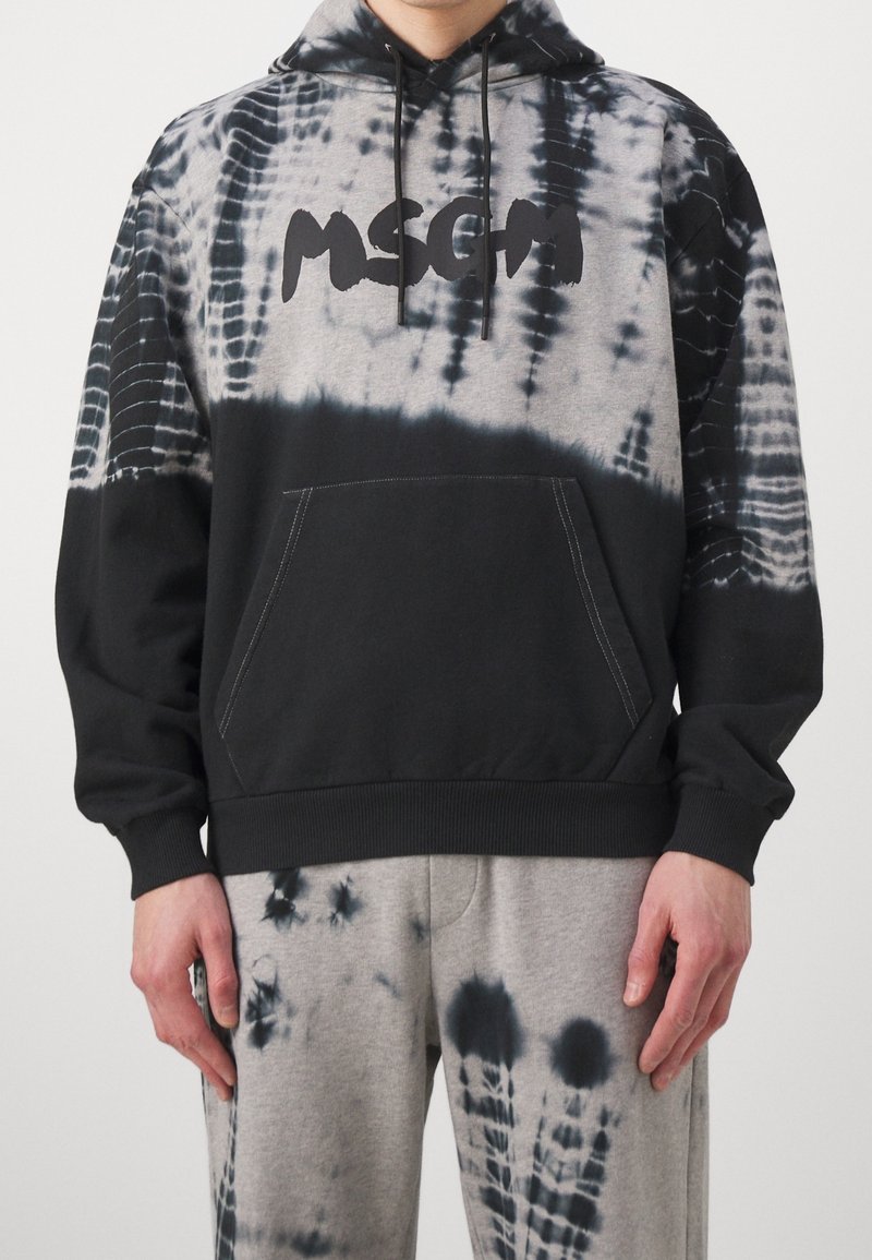 Sweat à capuche tie-dye noir et gris avec poche avant, capuche à cordon, et logo "MSGM". Poignets et ourlet côtelés ; modèle portant un pantalon assorti.