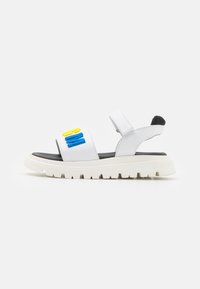 Sandales blanches avec des accents jaunes, dotées de larges brides, d'une marque en relief et de semelles intérieures en néon rembourrées. Semelle en caoutchouc texturé pour une bonne adhérence.