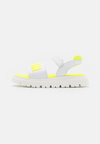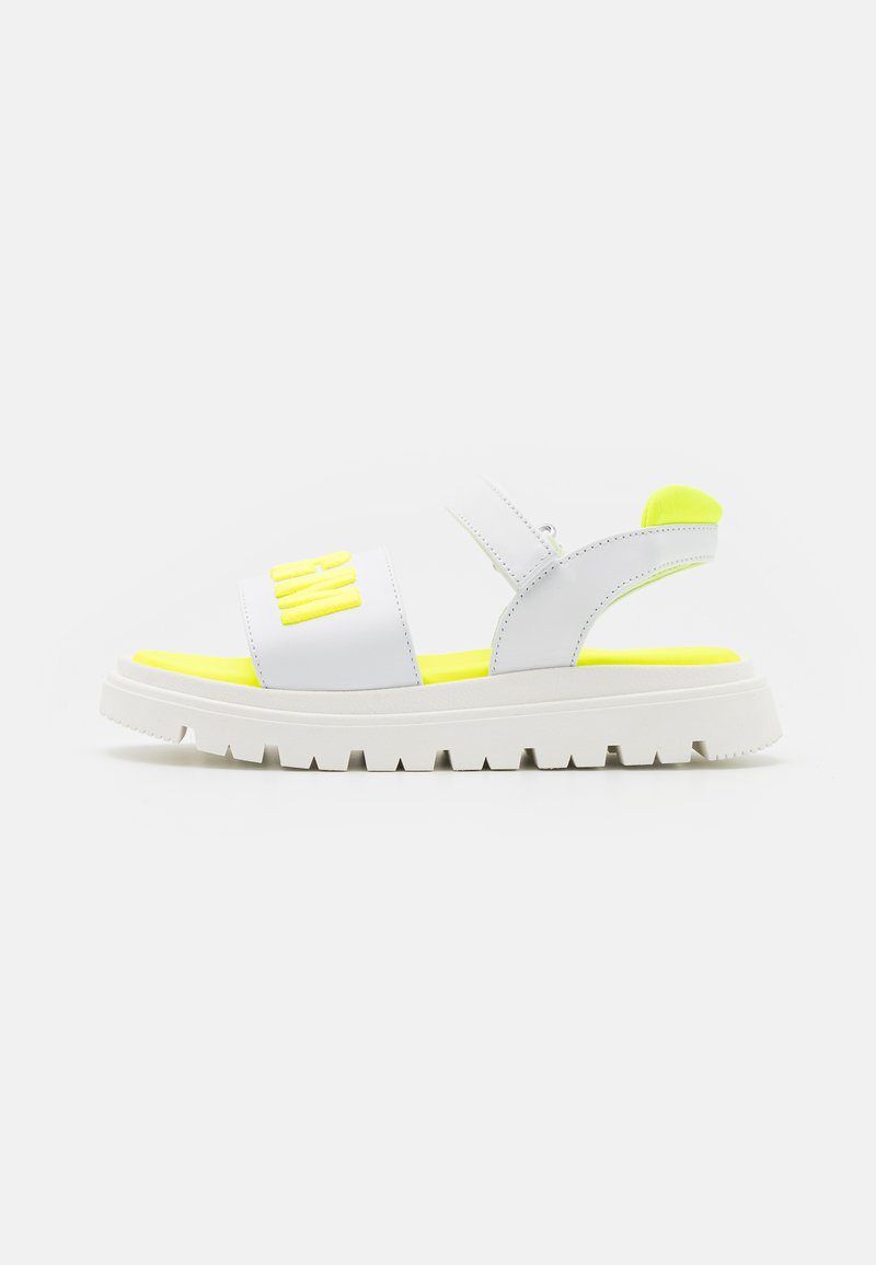 Sandales blanches avec des accents jaune fluo, dotées de larges sangles, de détails de boucle et d'une semelle blanche épaisse avec un relief texturé.