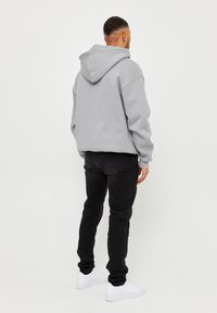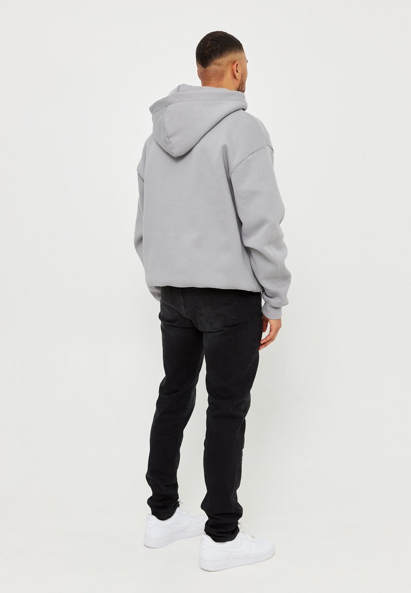Sweat à capuche gris à coupe décontractée, en coton, avec une poche kangourou. Associé à un jean noir et des baskets blanches.