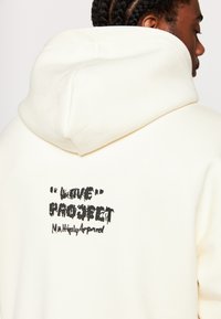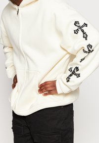 Sweat à capuche zippé crème en tissu doux, avec des motifs graphiques noirs de croix sur les deux manches. Poches avant et poignets côtelés.