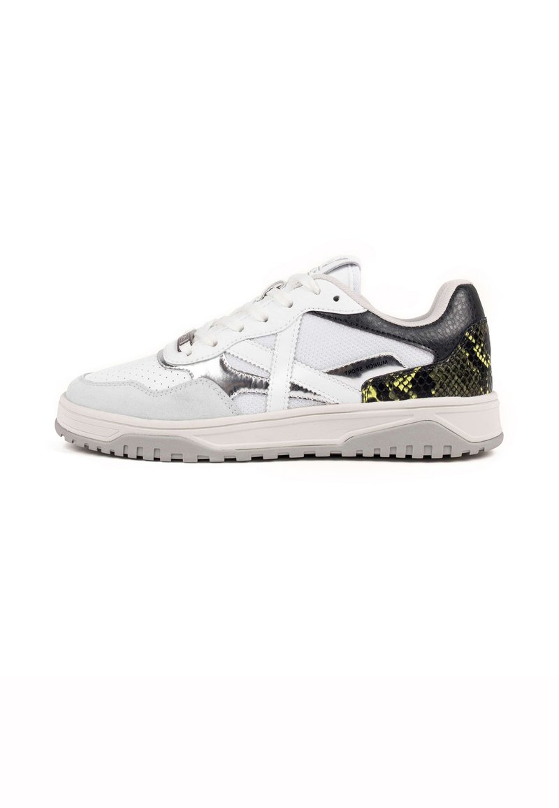Baskets blanches avec des accents gris et métalliques, dotées d'un talon texturé à imprimé serpent noir et vert. Semelle en caoutchouc avec détails antidérapants.