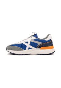 Baskets avec une tige en mesh bleue, des accents en daim gris et blanc, des éléments contrastants orange et une semelle épaisse blanche avec une semelle extérieure noire.