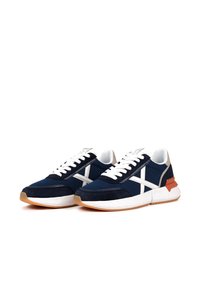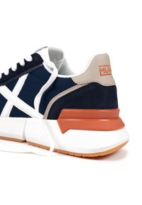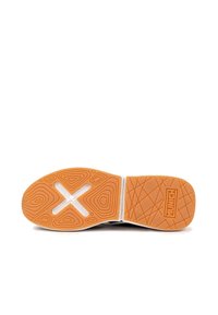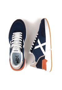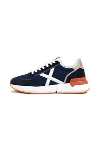 Baskets en daim bleu marine et mesh avec des accents blancs, une semelle en caoutchouc, et des détails orange sur le talon. Dotées d'un design classique à lacets.
