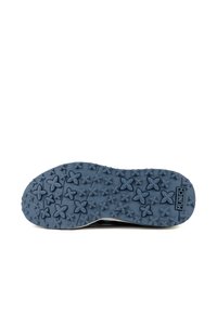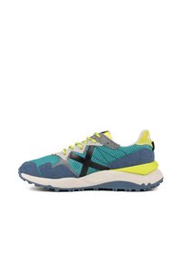 Baskets en mesh bleu et turquoise avec des accents gris et jaunes, dotées d'une semelle blanche épaisse et d'un détail logo noir sur le côté. Matériaux texturés.