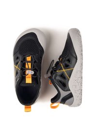 Chaussure de sport noire et grise avec panneaux en mesh, coutures jaunes distinctives, lacets élastiques et semelle en caoutchouc texturée comportant des motifs et des accents.