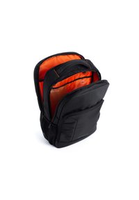 Sac à dos de grand format avec deux grands compartiments. À l'avant, des organisateurs pour stylos, cahiers et chargeurs, et sur les côtés, des espaces ajustables. La poche principale comporte des rangements avec ou sans fermeture éclair pour téléphone et stylos. Un autre espace est prévu pour un ordinateur portable et une tablette. Le dos rembourré offre confort et respirabilité avec une poche cachée en haut et une sangle pour fixer le sac à un chariot. Les bretelles sont rembourrées et ajustables.