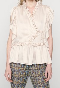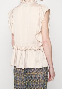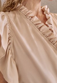 Blouse longue à manches longues rose clair avec un décolleté en V et un détail de volants à l'avant ; tissu lisse et poignets boutonnés.