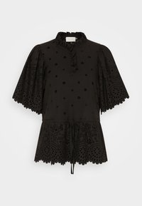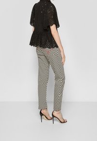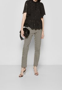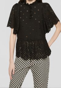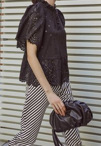 Femme portant un chemisier en dentelle œillets noire avec un col et des manches à volants, associé à un pantalon rayé diagonal noir et blanc.