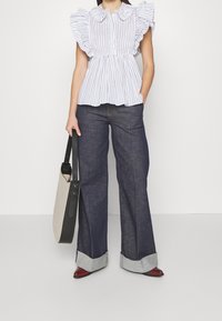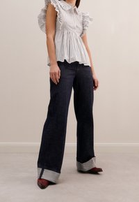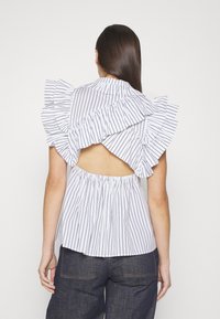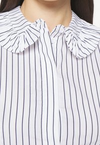 Chemise blanche avec des rayures verticales bleu marine, dotée d'un col à volants et de manches courtes froncées. Corps ajusté avec une texture froncée à la taille.