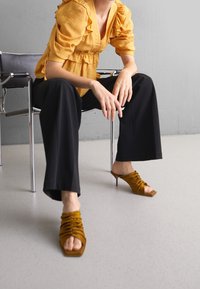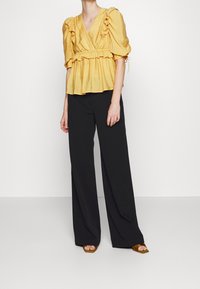 Blouse jaune à volants avec manches volumineuses et dos ouvert noué avec plusieurs nœuds, portée avec un pantalon noir sur un fond neutre.