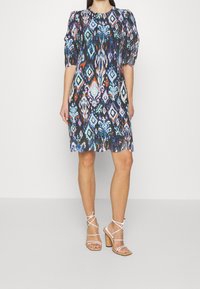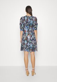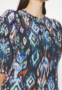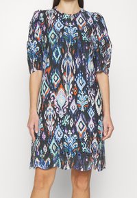 Femme portant une robe à motifs multicolores avec des manches bouffantes et des détails en broderie anglaise sur un tissu noir.
