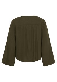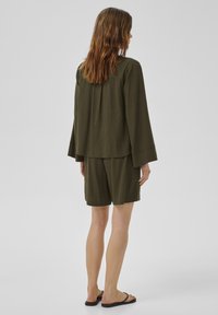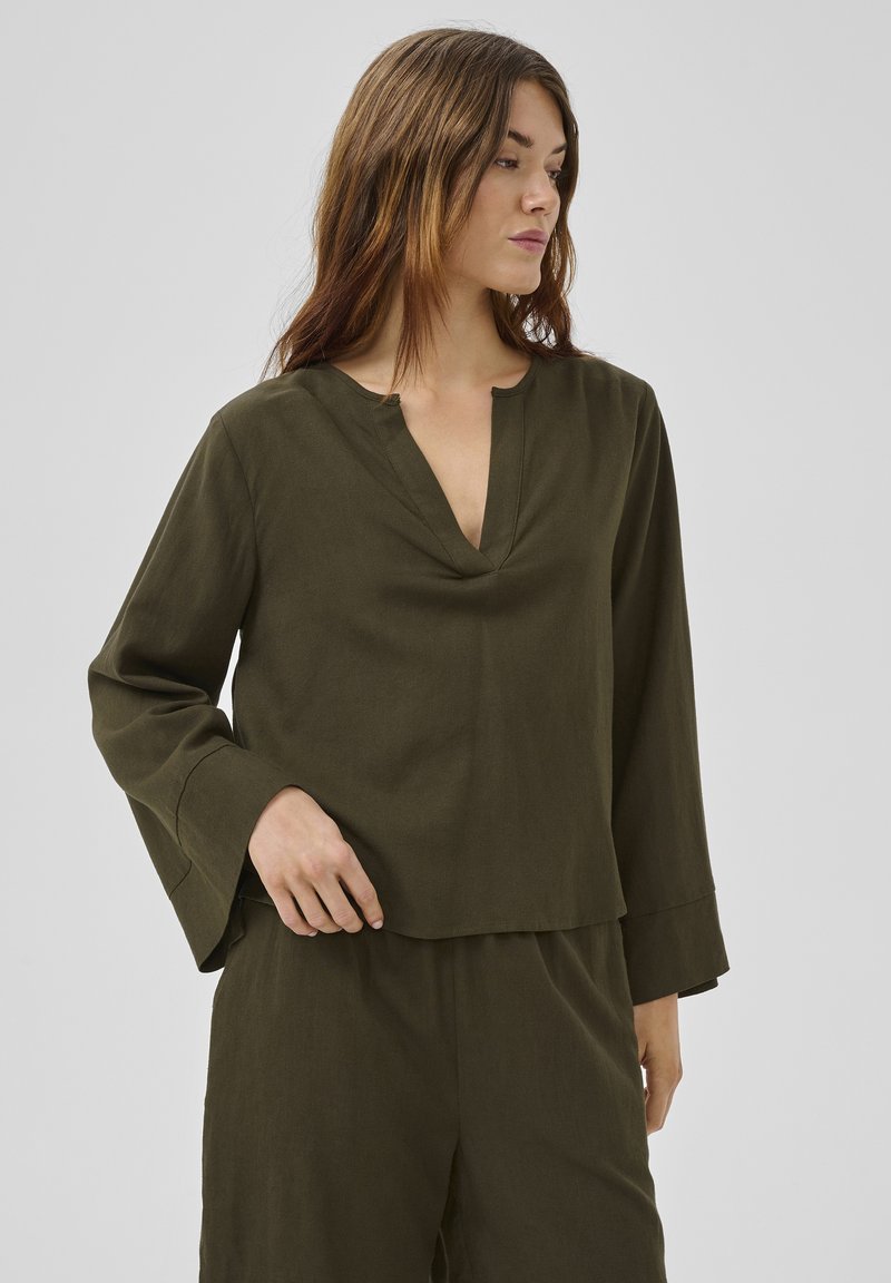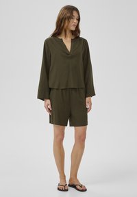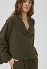 Femme portant un haut ample à manches longues vert olive et un pantalon assorti, regardant sur le côté sur un fond clair uni.
