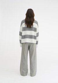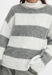 Personne portant un pull épais et oversize avec de larges rayures horizontales grises et blanches, et un col roulé blanc en dessous.