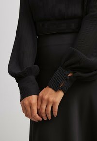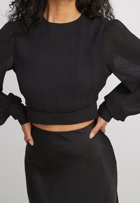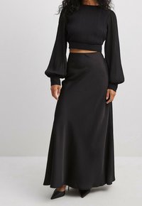 Ensemble noir deux pièces comprenant un haut court côtelé avec des manches bouffantes et une jupe maxi fluide et lisse. Le matériau est doux avec une finition mate.