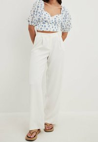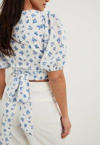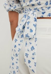 Haut court blanc avec un motif floral bleu, manches bouffantes et décolleté en V. Tissu texturé avec une sensation légère et aérienne, associé à un pantalon taille haute.