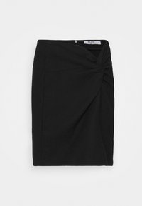 Mini-jupe noire avec un détail nœud à l'avant, réalisée en tissu doux. Associée à des talons noirs à brides, mettant en valeur une silhouette élégante et ajustée.