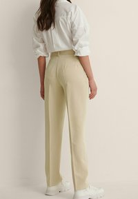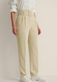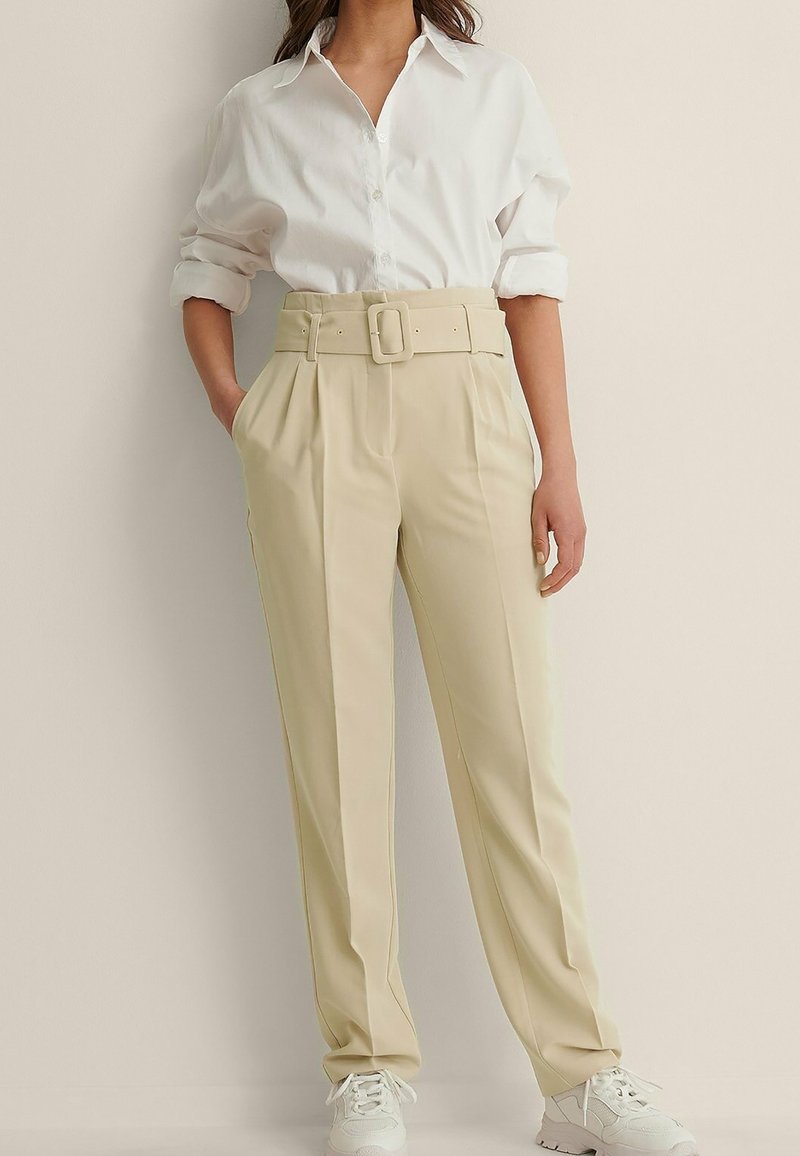 Pantalon beige taille haute avec une large ceinture à boucle carrée, des plis et des poches latérales, assorti à une chemise blanche boutonnée.