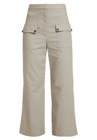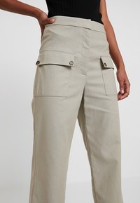 Femme portant un pantalon ample beige à larges jambes avec de grandes poches à rabat à l'avant et des bottines à talons noires sur un fond uni.