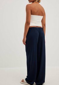 Femme portant un pantalon large bleu marine, un top blanc sans bretelles et des sandales blanches, se tenant devant un fond clair et uni.