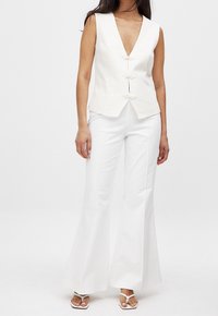 Gilet en lin blanc avec un décolleté en V profond et des fermoirs décoratifs ; associé à un pantalon blanc taille haute évasé et des sandales à fines brides.