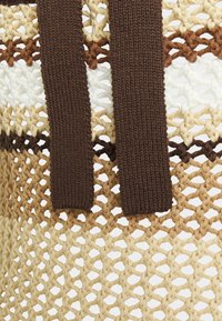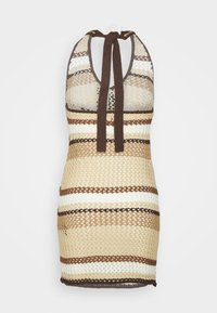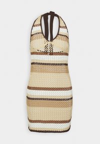 Robe sans manches en tricot à encolure halter avec des rayures horizontales beige, marron et blanche sur un fond uni.