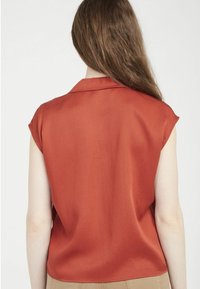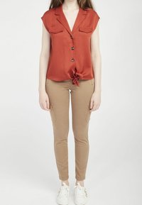Blouse à manches courtes couleur rouille avec col pointu, deux poches poitrine et détail noué à l'avant. Tissu lisse avec une coupe décontractée.