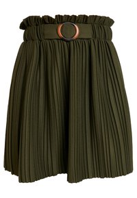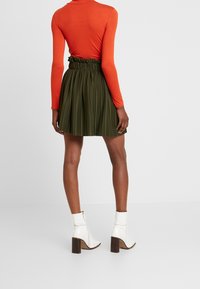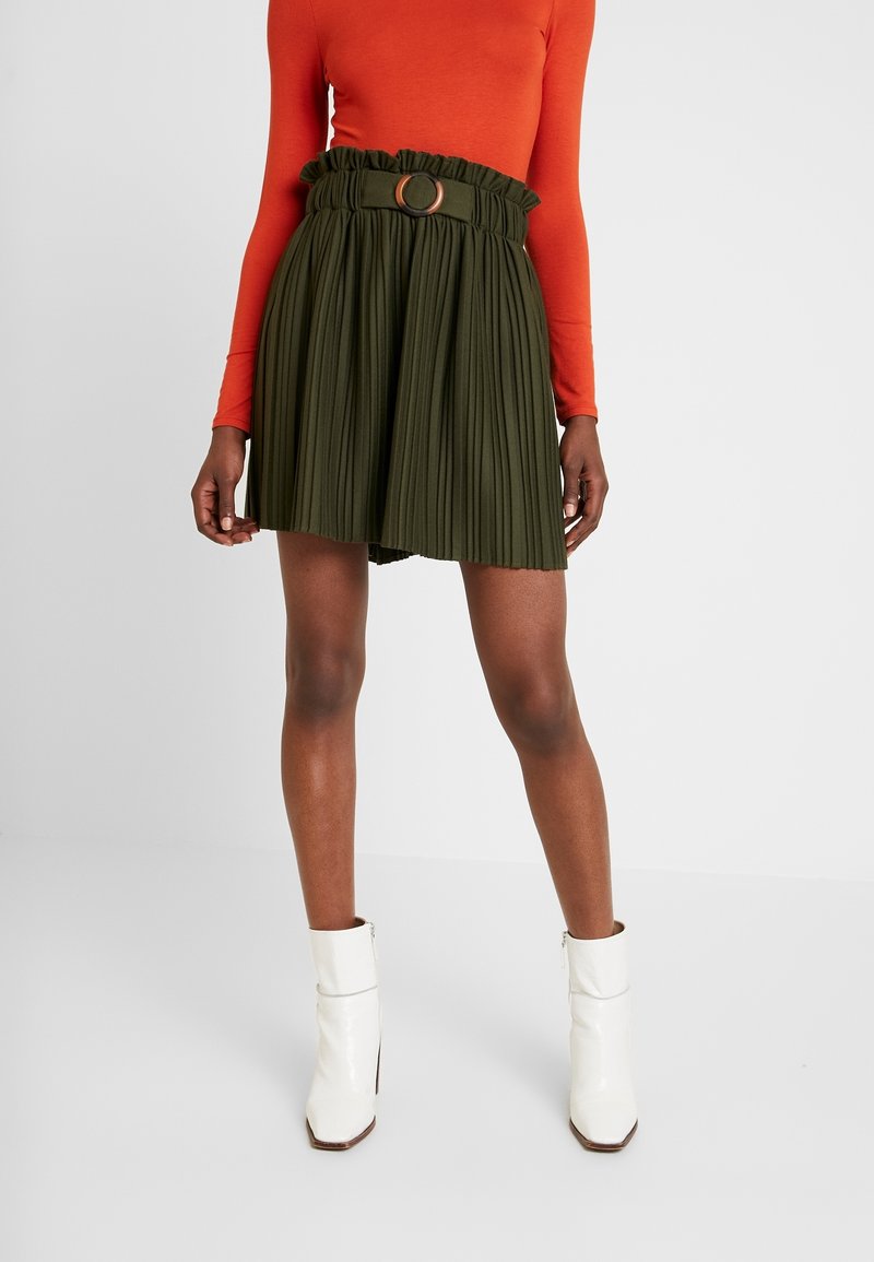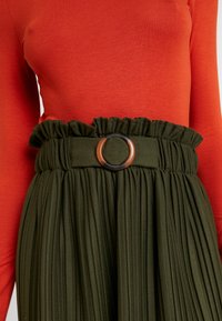 Jupe plissée verte avec une taille froncée et un accent circulaire marron, associée à un haut à manches longues orange et des bottines blanches.