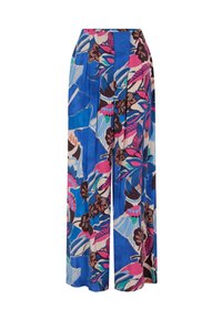 Pantalon fluide bleu à jambes larges présentant des motifs floraux vibrants en rose, brun foncé et bleu sarcelle, avec des poches latérales pour plus de fonctionnalité.