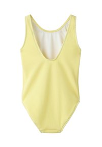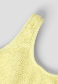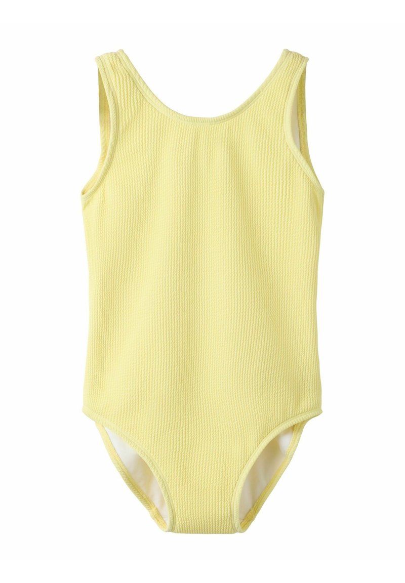 Maillot de bain une pièce jaune nervuré avec larges bretelles et encolure dégagée, adapté aux enfants.