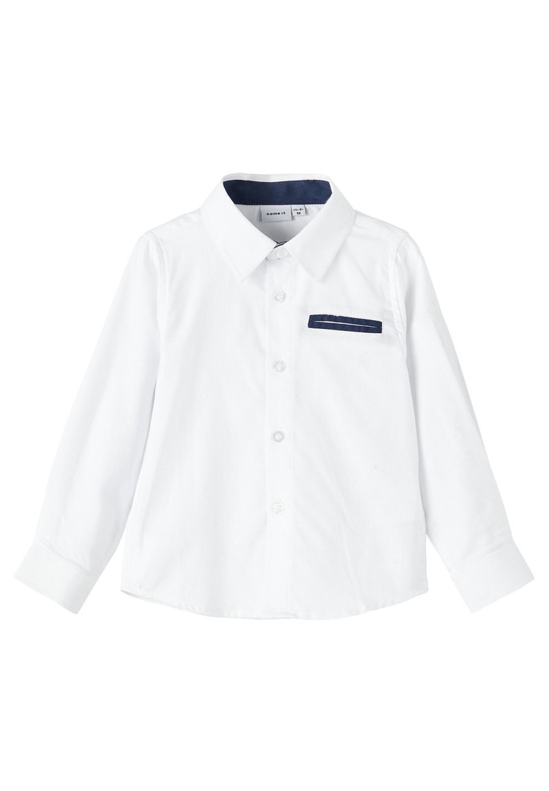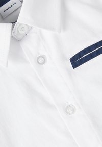 Chemise blanche à manches longues avec col intérieur bleu foncé et bordure assortie bleu foncé sur la poche gauche de la poitrine.