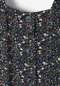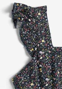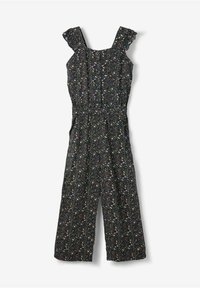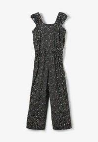 Combinaison noire sans manches avec imprimé floral multicolore, petit motif, boutonnée à l'avant, bretelles à volants et pantalon à jambes larges.