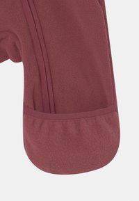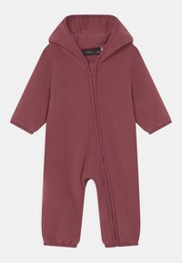 Combinaison en polaire bordeaux avec une capuche, fermeture éclair intégrale, manches longues et poignets élastiques aux chevilles. Texture lisse, sans motifs ni accents.