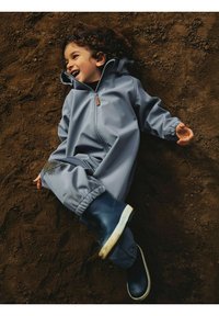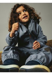 Enfant aux cheveux bouclés portant une tenue grise à fermeture éclair et des chaussures bleu marine, assis et regardant vers le haut avec une expression pensive.
