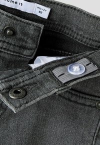 Jean denim gris pour enfants avec poches avant, passants pour ceinture, fermeture par bouton, et légère décoloration sur les jambes.