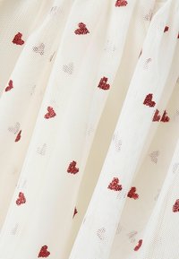 Jeune fille aux cheveux foncés portant une robe blanche ornée de petits cœurs rouges, debout devant un fond gris clair uni.