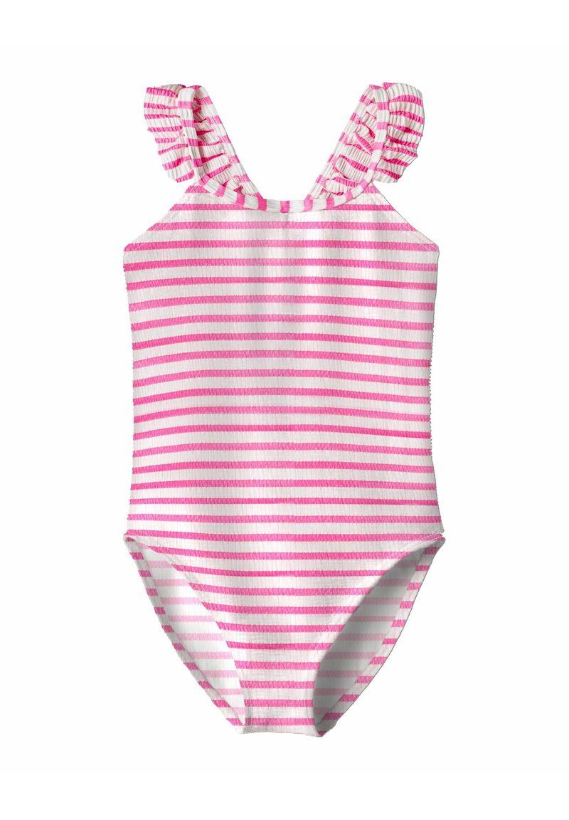 Maillot de bain une pièce pour filles avec des rayures horizontales roses et blanches et des bretelles à volants.