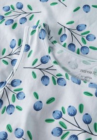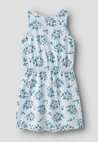 Robe sans manches bleu clair avec une taille élastique et un motif de baies bleues et de feuilles vertes sur des branches.