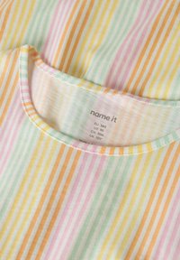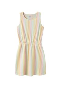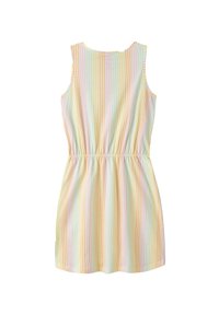 Robe sans manches jusqu'aux genoux avec taille élastique et rayures verticales pastel en jaune, rose, vert et blanc.