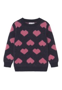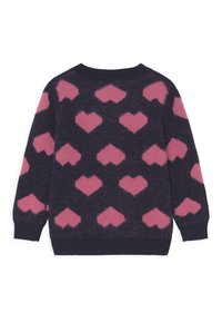 Pull bleu foncé à poils avec des motifs de cœurs roses répartis de manière uniforme sur le devant, les manches et le dos, avec des poignets et un col côtelés.