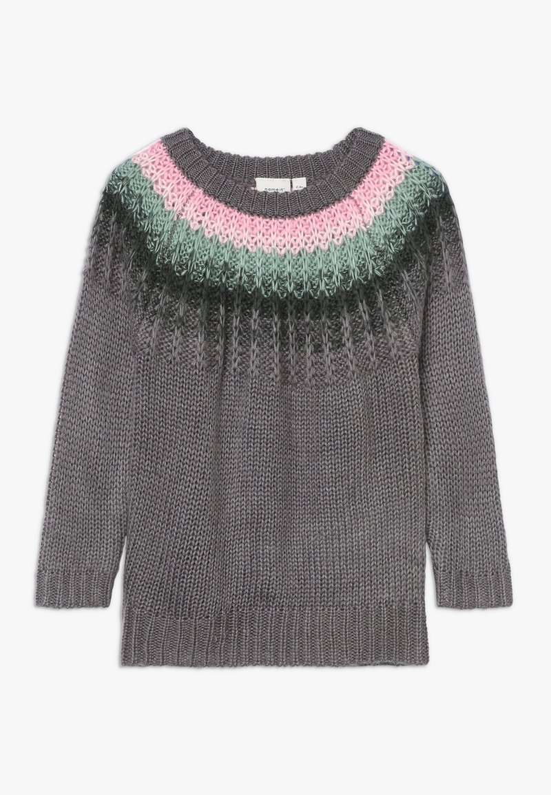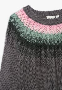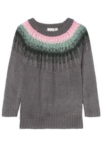 Pull gris en maille avec un empiècement color-block vert, rose et gris foncé. Manches longues avec poignets et ourlet côtelés.