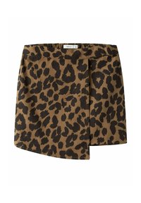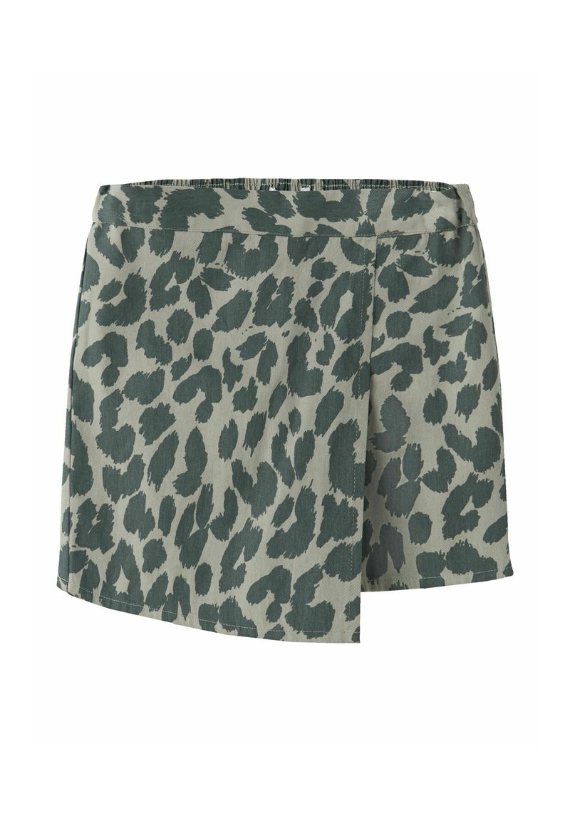 Jupe courte verte avec imprimé léopard vert foncé et détail asymétrique sur le devant