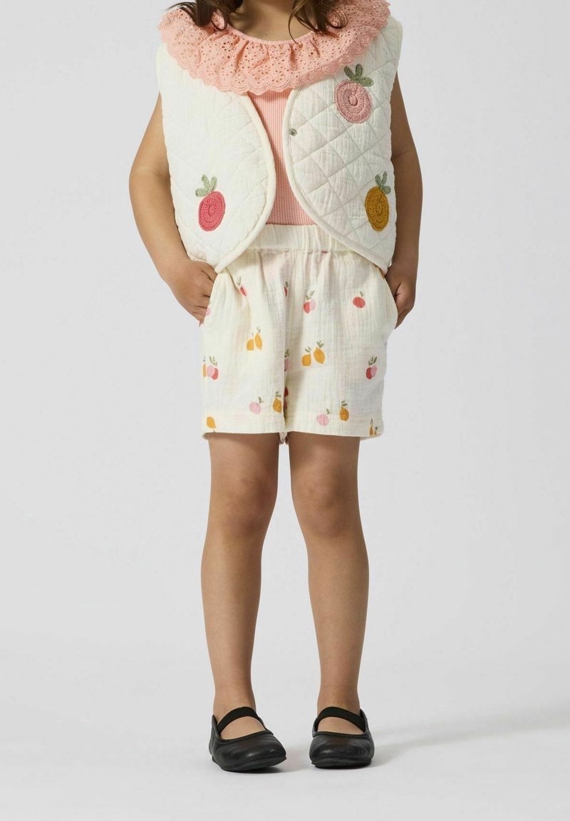 Enfant portant un haut à col volanté rose, un gilet matelassé blanc avec des patchs de fruits, un short assorti à motif fruité et des chaussures Mary Jane noires.