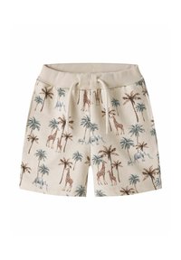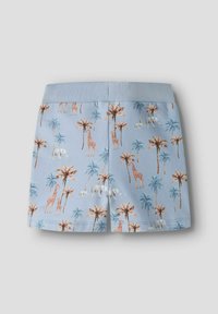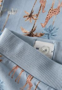 Shorts bleu clair avec ceinture côtelée et cordon, décorés d’un motif de palmiers, girafes et éléphants.
