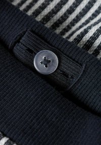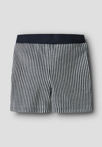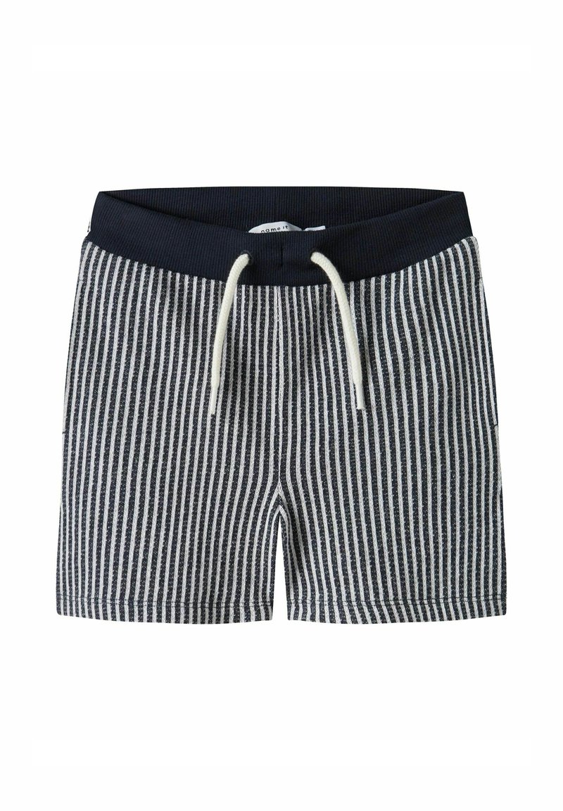 Short pour tout-petit à rayures verticales bleu marine et blanc avec taille élastique et cordons blancs.