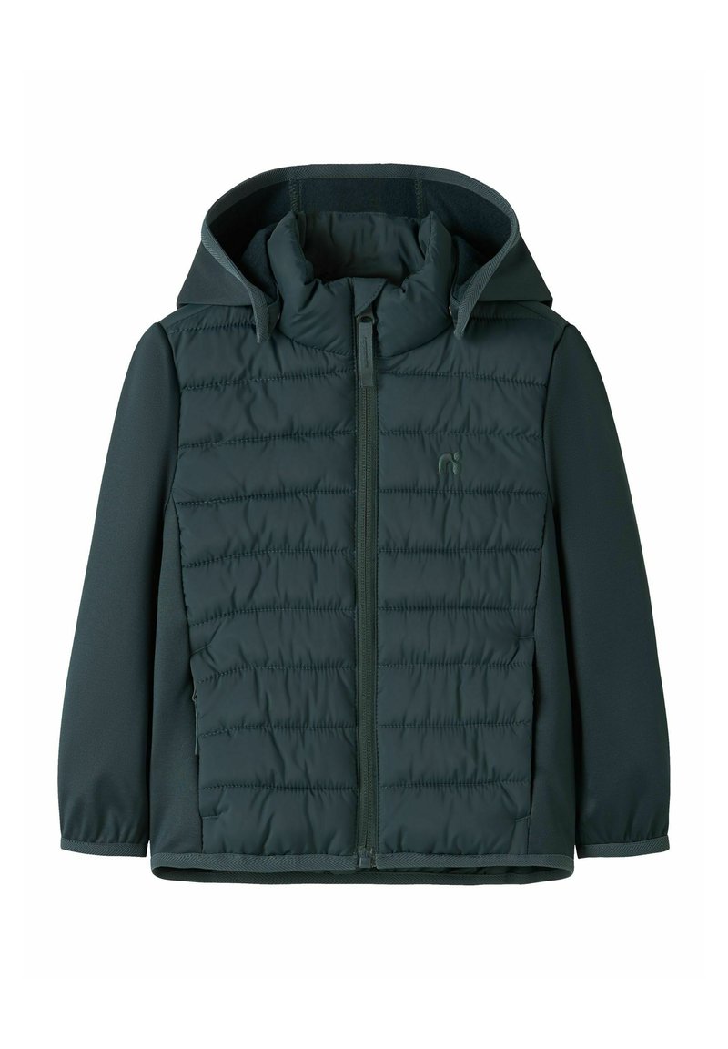 Veste à capuche pour tout-petit de couleur vert foncé, avec devant matelassé, manches lisses, fermeture éclair complète à l'avant et petit logo sur la poitrine.